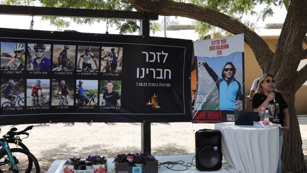 Nissan Kalderon, the brother of hostage Ofer Kalderon, and Nir Zalmanovich, whose father Hillel Zalmanovich was murdered while cycling on Oct. 7, also attended the event.