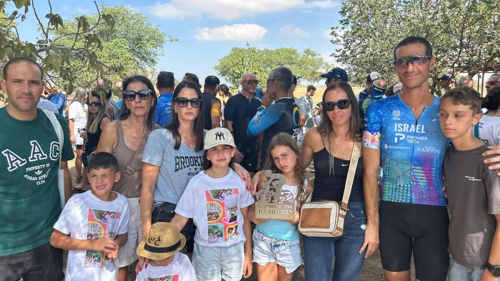 Nir Zalmanovich and his family at a memorial ceremony in Kibbutz Be’eri honoring 10 cyclists killed by Hamas on Oct. 7, 2023, including his father, Hillel Zalmanovich, Oct. 5, 2024. Photo: Amelie Botbol.