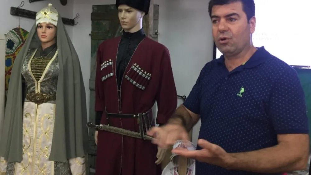 Madaji, a resident of Rihaniya, stands next to life-sized models in traditional dress along with antique furniture and household items as he shares the story of the Circassians.