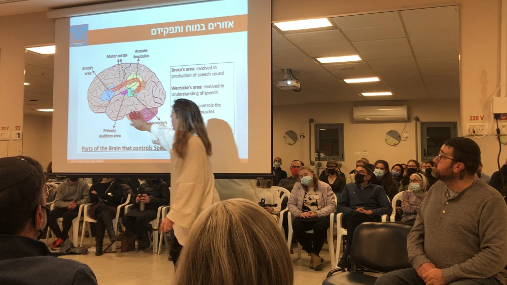 Fast-forward to last Wednesday night, about four and a half years after Eitan’s stroke—after a long and still ongoing period of recovery, therapies, successes and setbacks—to an event in the Efrat Medical Center conference room. More than 100 community members had gathered to hear a presentation prepared by Leora and Eitan, titled “The Koach Eitan Initiative: Educating and Raising Awareness About Stroke and Aphasia.”