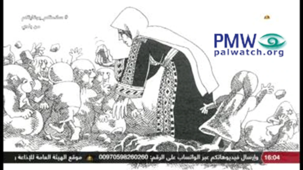 One of the cartoons showed Fatima handing Handala an AK-47 rifle, according to PMW, while another showed Fatima with roots growing out below her dress connecting her to the ground, handing out rocks to children. One of the children, a girl, can be seen throwing a rock at an Israeli/Jew with a large nose and a Star of David on his hat who is covering his head.