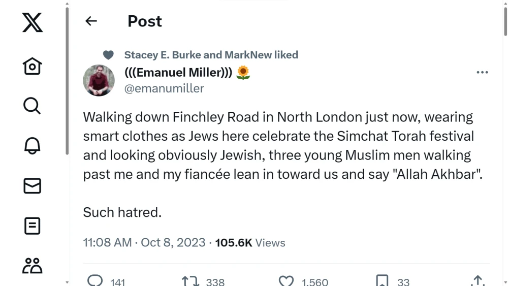 “I just passed two cars in West London driving with Palestinian flags flying from each window, bouncing up and down in their cars, seemingly celebrating like they were having a party,” Riley tweeted.