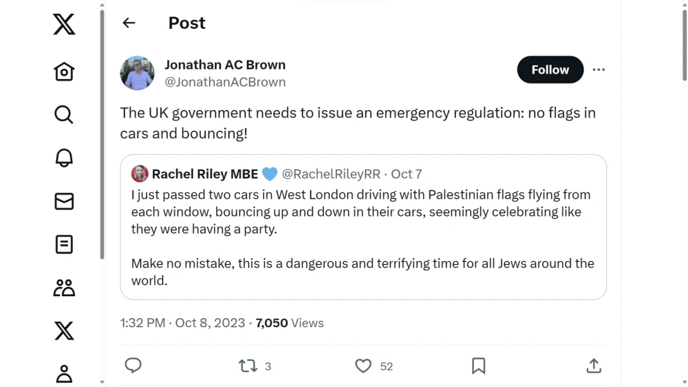Brown responded by sneering about an “emergency regulation: no flags in cars and bouncing!” London Jews currently experiencing Muslim antisemitism might not find this so funny.