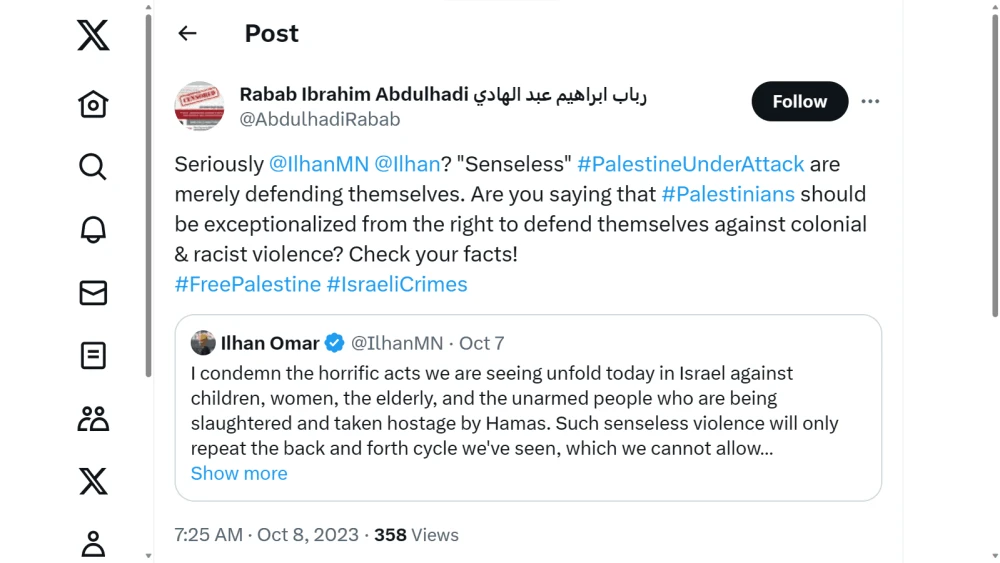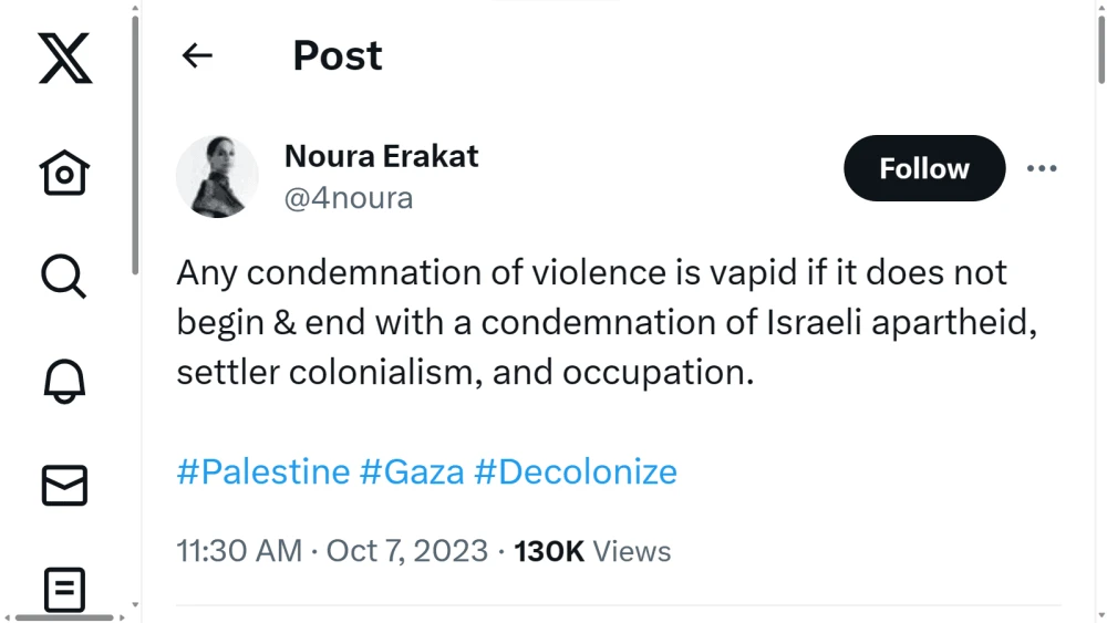 “Any condemnation of violence is vapid if it does not begin & end with a condemnation of Israeli apartheid, settler colonialism, and occupation,” she tweeted.