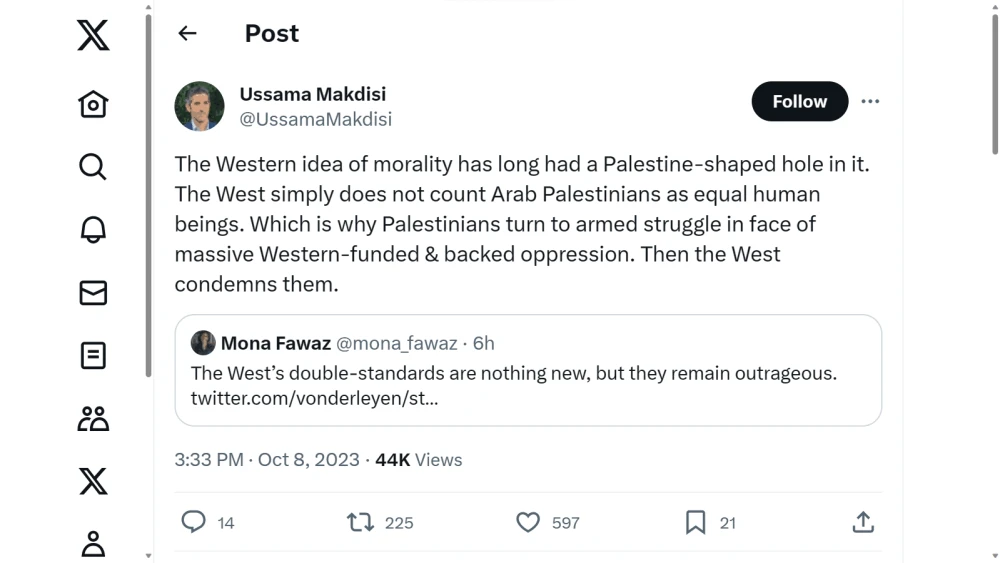 “The West simply does not count Arab Palestinians as equal human beings,” he tweeted to justify terrorist atrocities. Thus, “Palestinians turn to armed struggle in face of massive Western-funded & backed oppression. Then the West condemns them.”