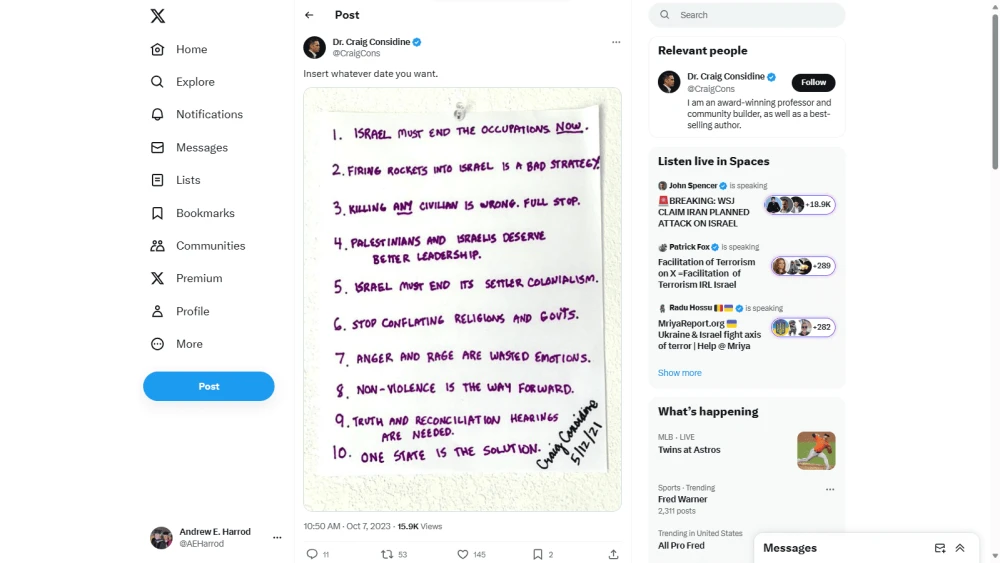 Self-proclaimed interfaith guru and all-around peacemaker Craig Considine, a Rice University sociology lecturer, responded to Hamas ravages with his own peace proposals reflecting his longstanding animus against Israel.