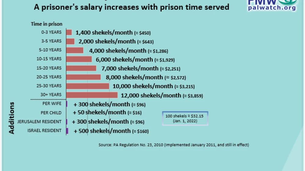 The P.A. pays every Palestinian terrorist arrested by Israel a monthly salary. The starting terrorist “salary” of 1,400 shekels ($450) rises automatically with time spent in prison, reaching a huge 12,000 shekels ($3,859). The following chart, based on the P.A.’s 2004 Law of Prisoners and Released Prisoners and its implementing regulations, shows the terrorist prisoners “pay scale”: