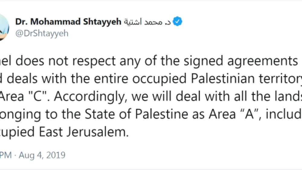 “Israel does not respect any of the signed agreements,” wrote Shtayyeh, “and deals with the entire occupied Palestinian territory as Area ‘C’. Accordingly, we will deal with all the lands belonging to the State of Palestine as Area ‘A’, including occupied East Jerusalem.”