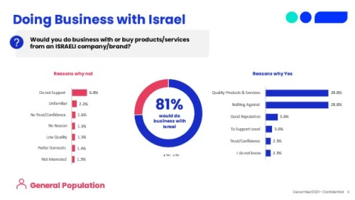 Eighty-one percent of the general public in the U.S. who were surveyed would do business with an Israeli company or purchase a product made-in-Israel, and 34% of the businesspeople surveyed stated that their opinion regarding doing business with Israel improved in the last year.